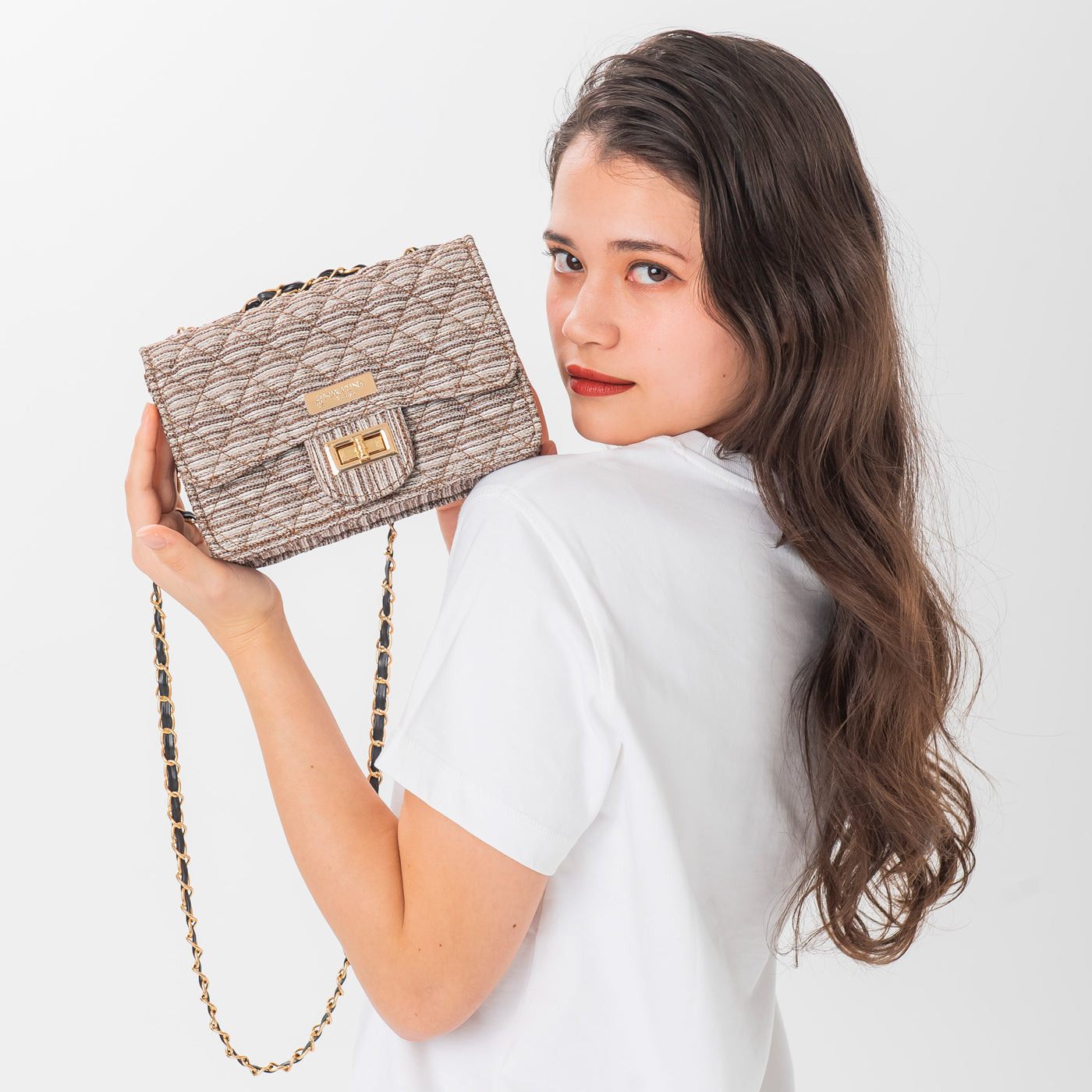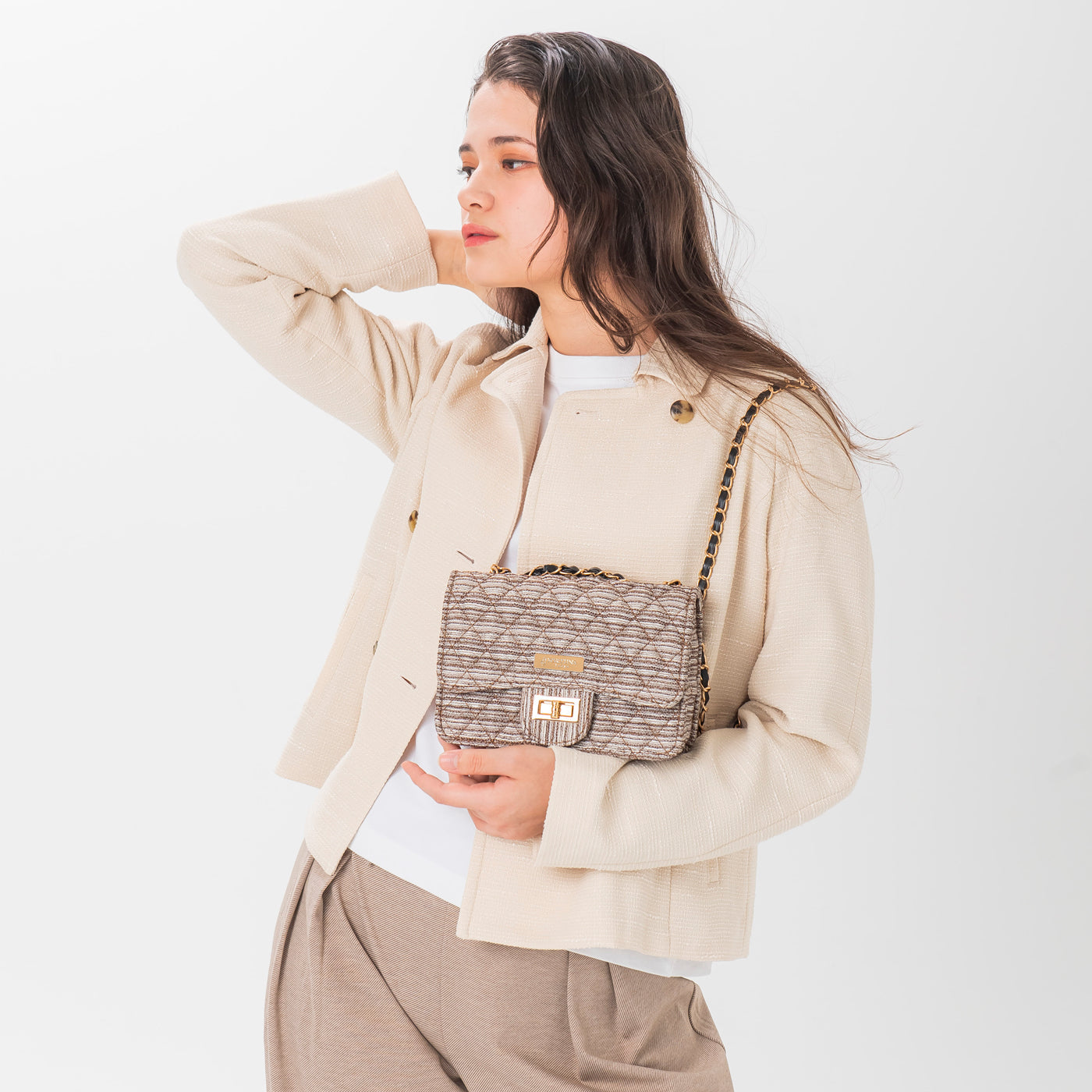 The Kyoto woven textile Matelasse Chain Bag gives off a graceful and elegant impression.