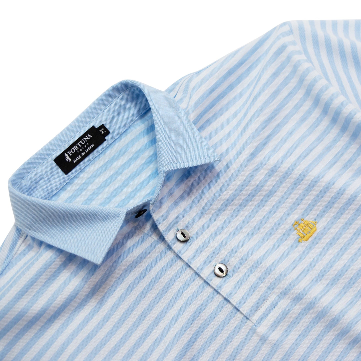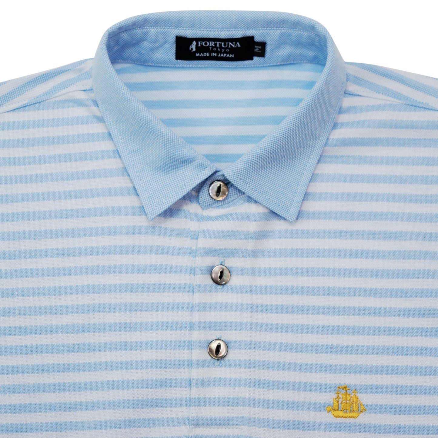 A short sleeve polo shirt embroidered with a sailboat, the motif of the "04. Adventure" series. The border design resembles ocean waves, and the buttons are made of shells. Made with domestic materials.